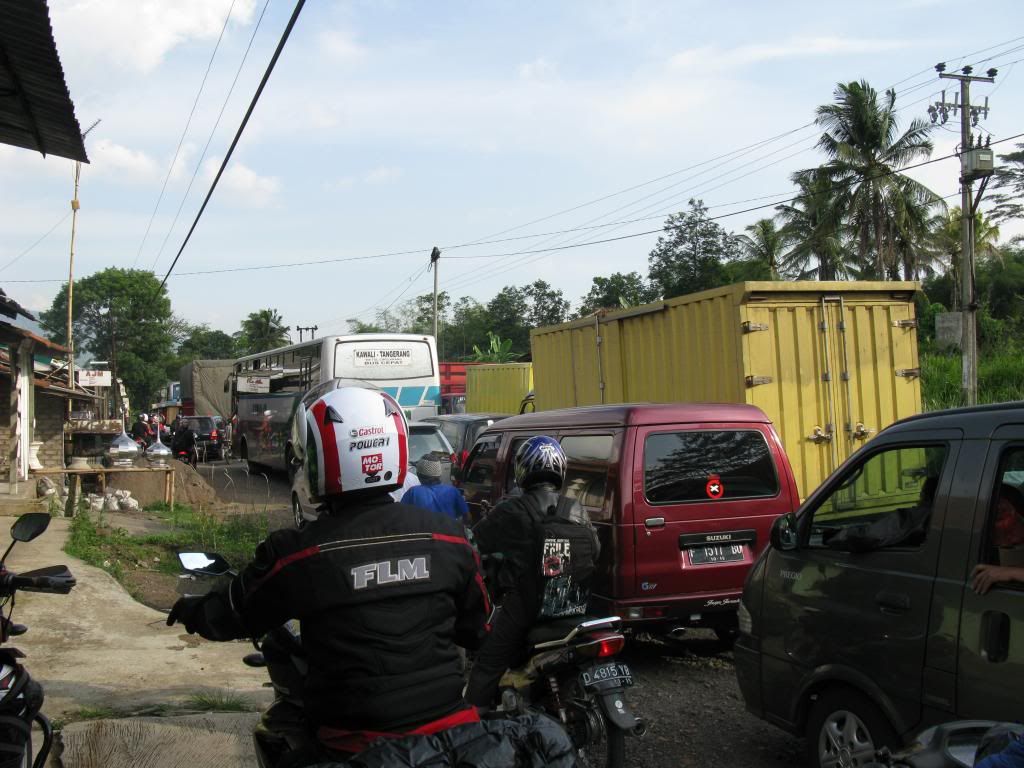 Udah sampe dibawah mendekati tasik kok macet lagi? (Ada apa ini bikin frustasi saja!). Mulai panas lagi nih kepala. Clingak clinguk karena tidak bisa lewat. Kami mulai menyusuri pinggir jalan agar bisa lolos dari kemacetan ini. Bro ari sudah menghilang kedepan. Tahunya doi lagi beli minum. Haus ya bro. Sama kita juga. Kami akhirnya memutuskan untuk istirahat sejenak sambil menunggu kemacetan mereda.